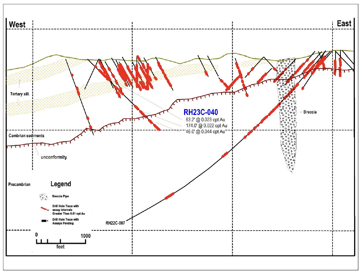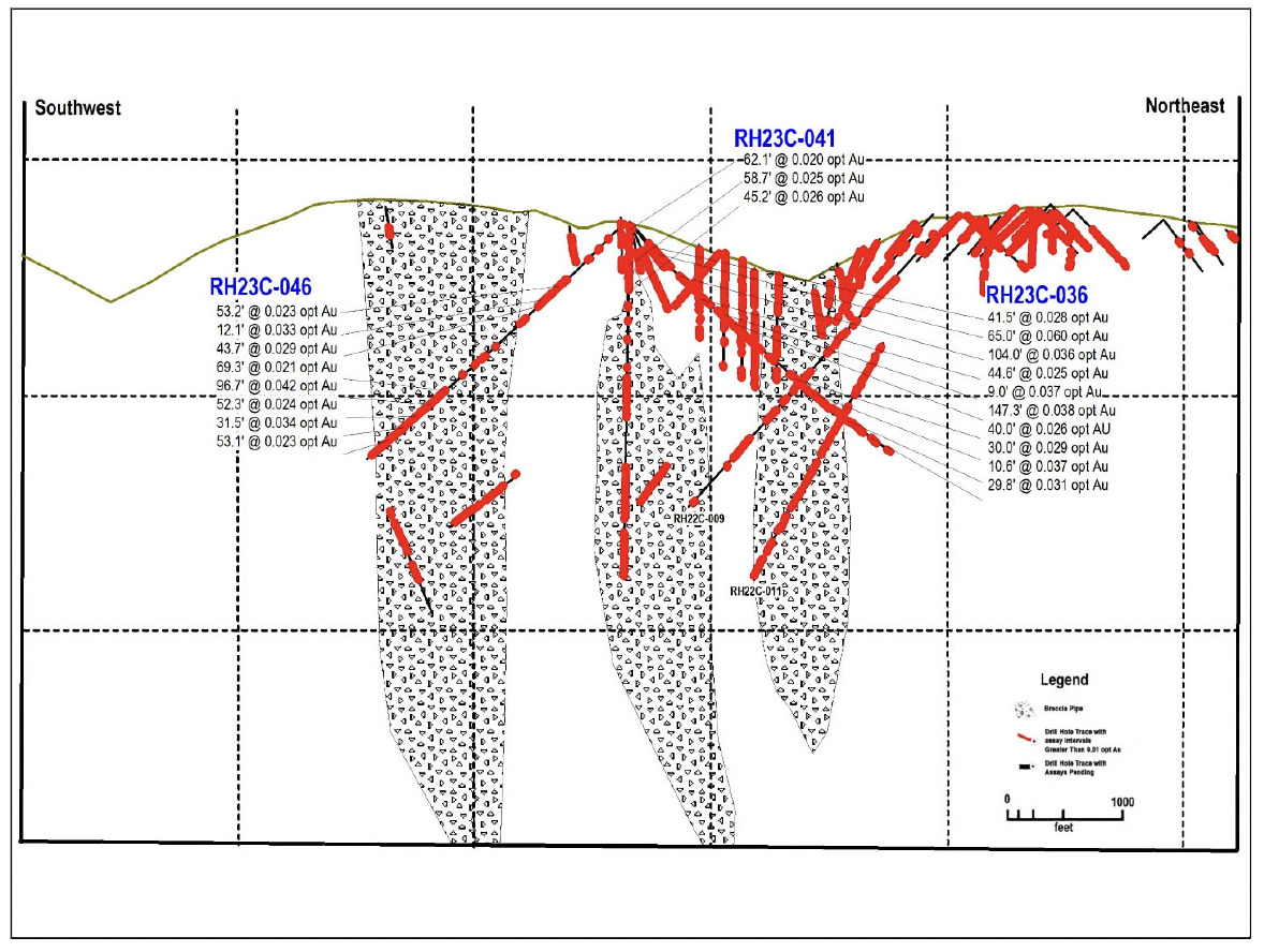 - RH23C-045 intersecting 0.024 oz/ton over 112.3 feet (0.82 grams/tonne over 34.2 meters)
