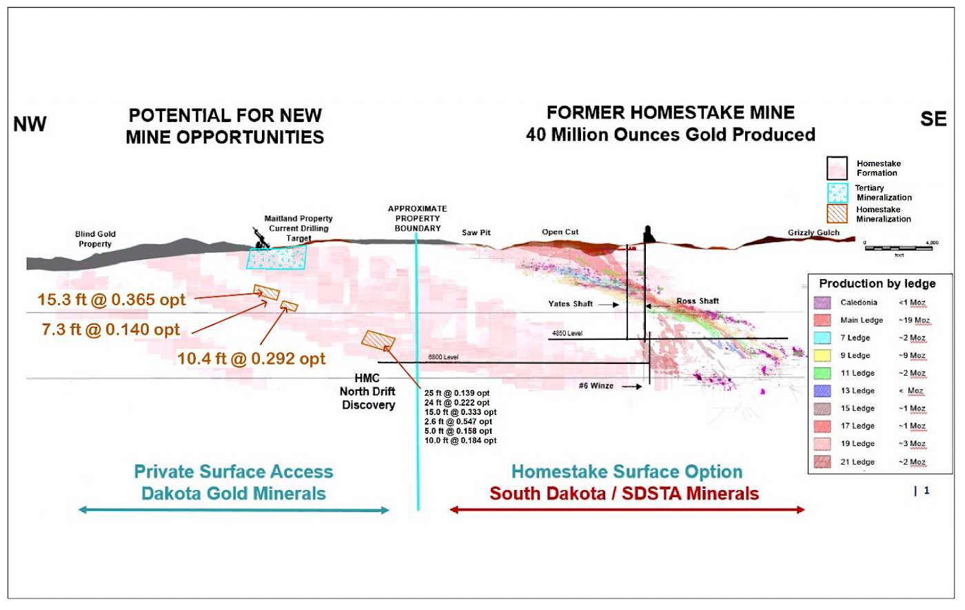 Figure 1. Long Section of the Homestake Gold Mine, Homestake’s North Drift Discovery, and Dakota Gold’s Drill Intercepts.