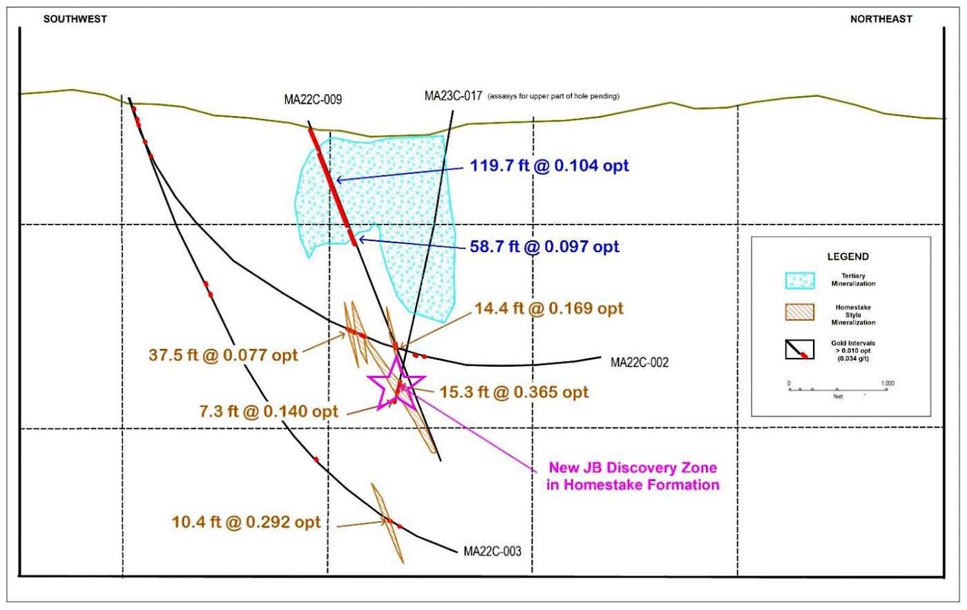 - MA23C-017 intersected 0.365 oz/ton Au over 15.3 feet (12.51 grams/tonne over 4.7 meters) within a wider zone grading 0.204 oz/ton Au over 31.3 feet (7.0 grams/tonne Au over 9.5 meters) in Homestake Formation.