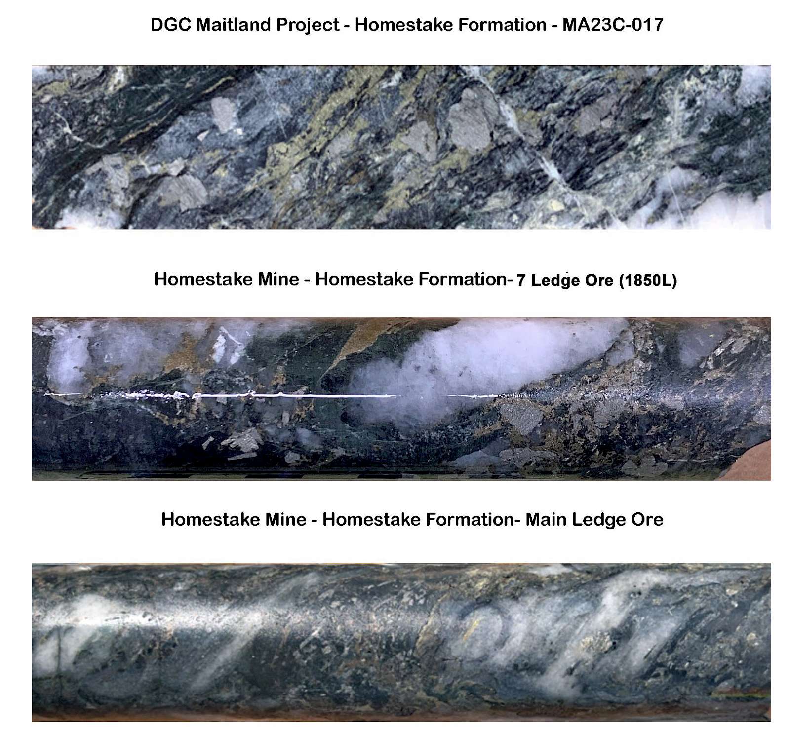 - The gold mineralization encountered in MA23C-017 is associated with quartz-carbonate veins with chlorite selvages and adjacent pyrrhotite-pyrite-arsenopyrite mineralogy. This alteration and mineralization are the same as the high-grade mineral zones found at the Homestake Mine.