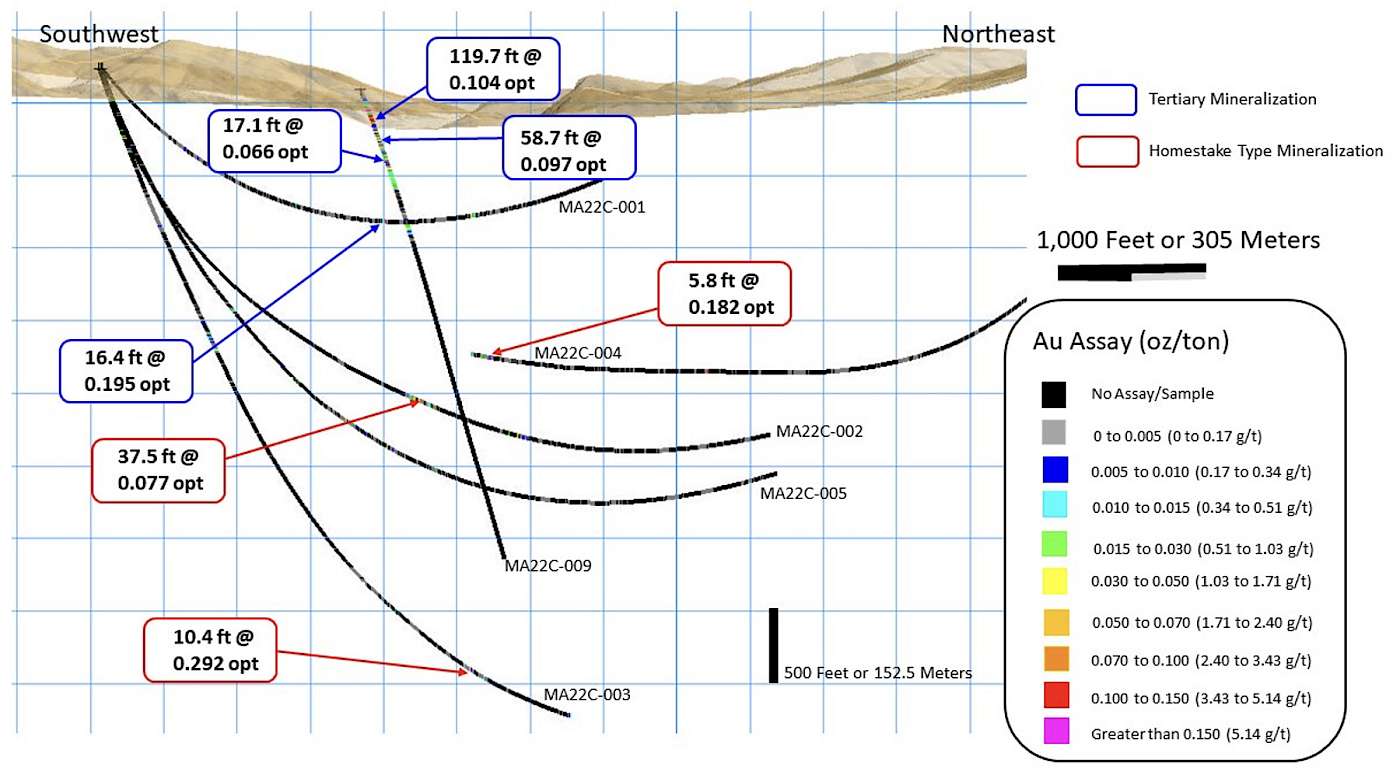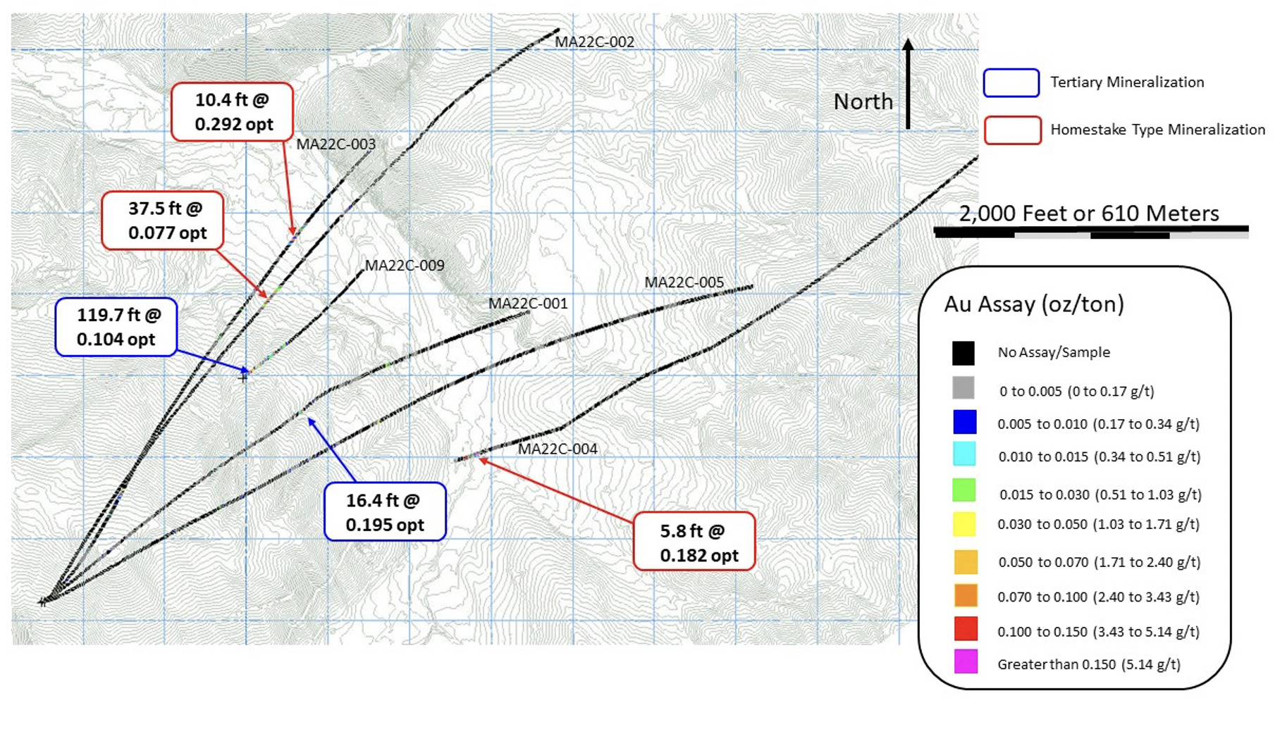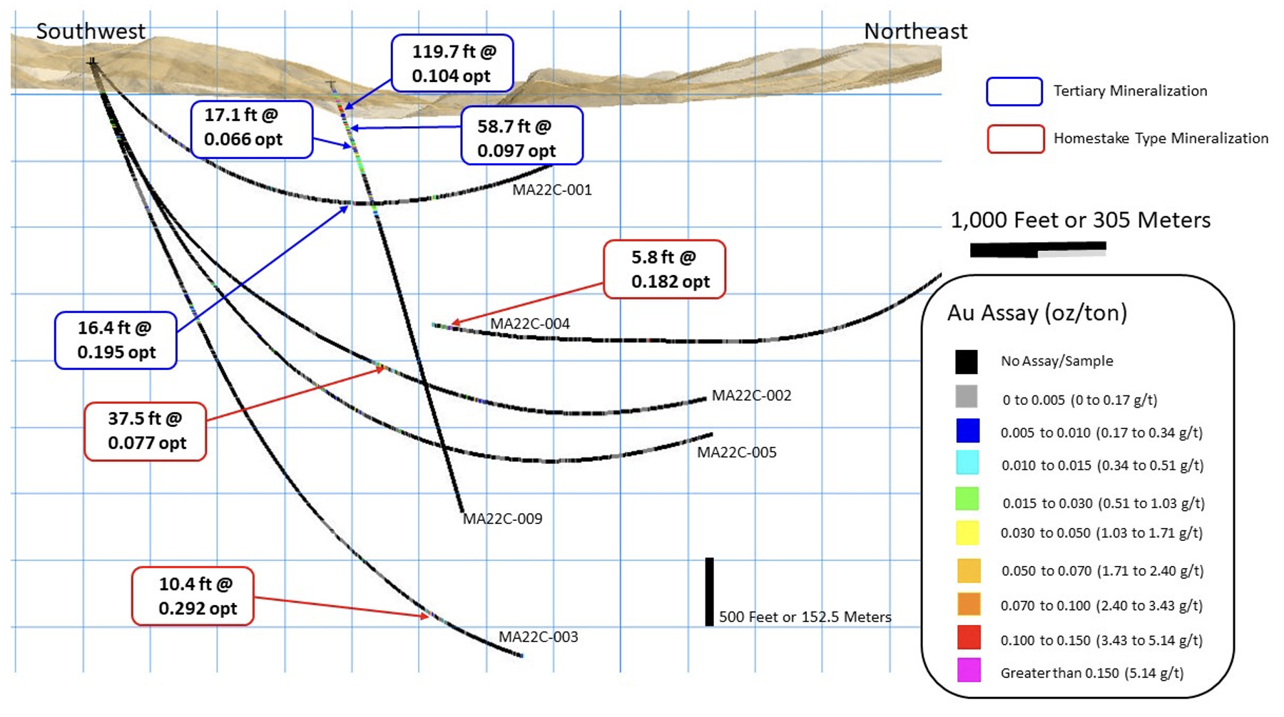- MA22C-003 intersected 0.292 oz/ton Au over 10.4 feet (10.03 grams/tonne over 3.17 meters) at 5,039.3 feet (1,535.98 meters) within the Homestake Formation.