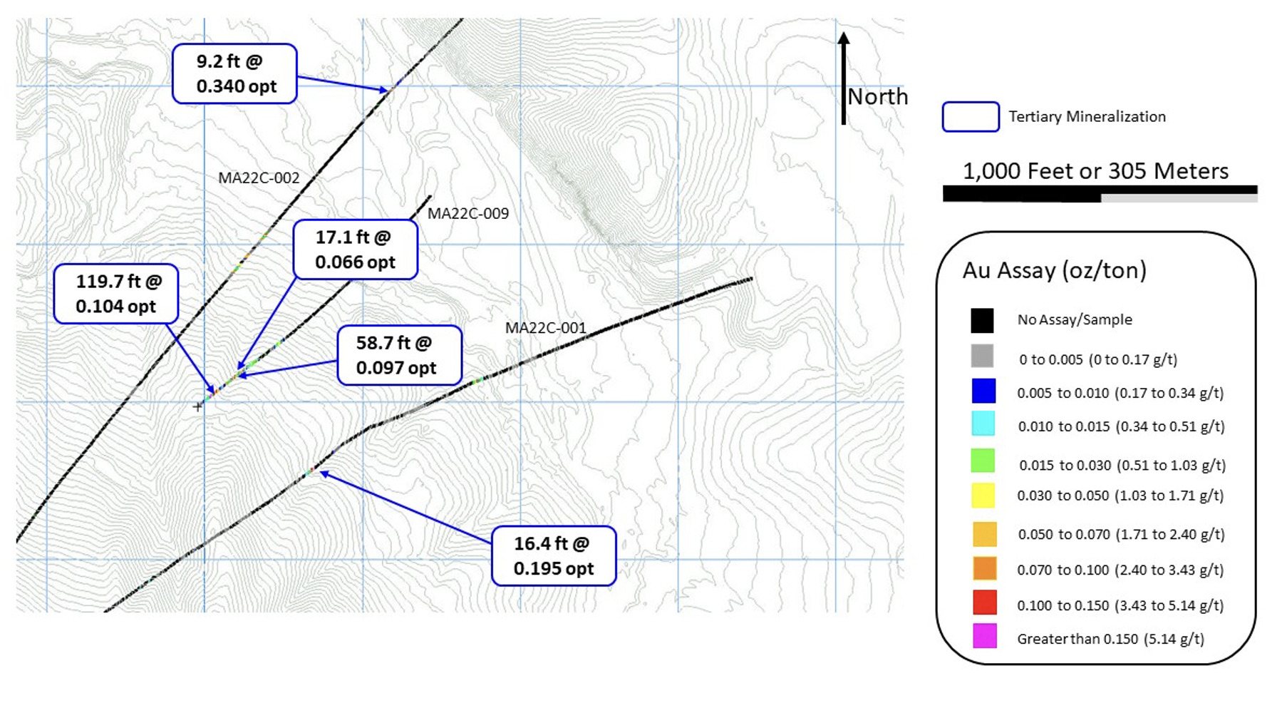 - MA22C-001 had previously intersected 0.195 oz/ton Au over 16.4 feet (6.69 grams/tonne over 5.0 meters) and MA22C-002 intersected 0.340 oz/ton Au over 9.2 feet (11.66 grams/tonne over 2.8 meters). MA22C-001 and MA22C-002 are located 1,220 feet apart in plan view, suggestive of potential strike length. Follow up drilling will continue to test the continuity and thickness.