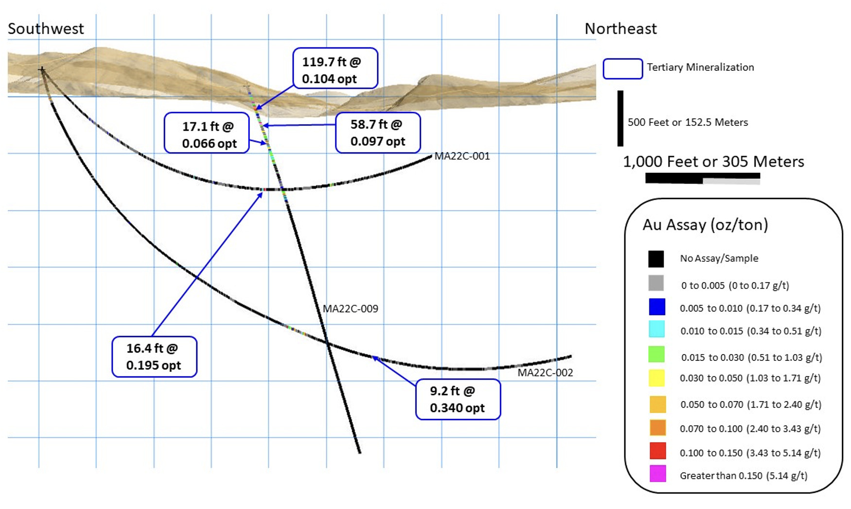- Drill Hole MA22C-009, which intersected 0.104 oz/ton Au over 119.7 feet (3.58 grams/tonne over 36.48 meters), was designed to test the continuity of Tertiary breccia hosted gold mineralization encountered in MA22C-001 and MA22C-002.