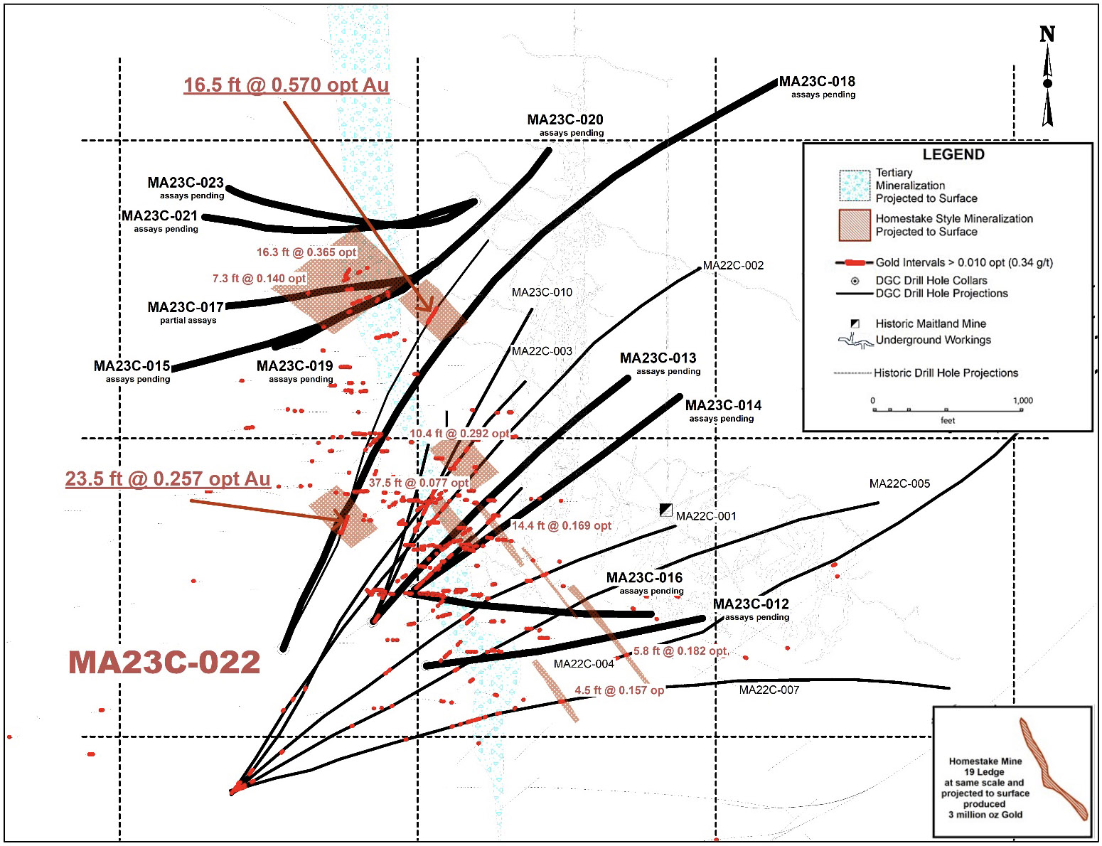 LEAD, SOUTH DAKOTA – Dakota Gold Corp. (NYSE American: DC) (“Dakota Gold” or the “Company”) is pleased to report on partial assay results from drill hole MA23C-022 which encountered Homestake Formation in two separate intersections at the Maitland Gold Project (“Maitland”) in the heart of the Homestake District of South Dakota. MA23C-022 was designed as a step-out drill hole south of the JB Gold Zone discovery hole MA23C-017 at Maitland. MA23C-017, reported on May 4, 2023, intersected 0.365 oz/ton Au over 15.3 feet (12.51 grams/tonne over 4.7 meters). The two intercepts reported in MA23C-022 continue to confirm that Homestake-style gold mineralization is present 3.1 miles (5.0 km) northwest of the +40-million-ounce historic Homestake Mine along the Homestake structural corridor.