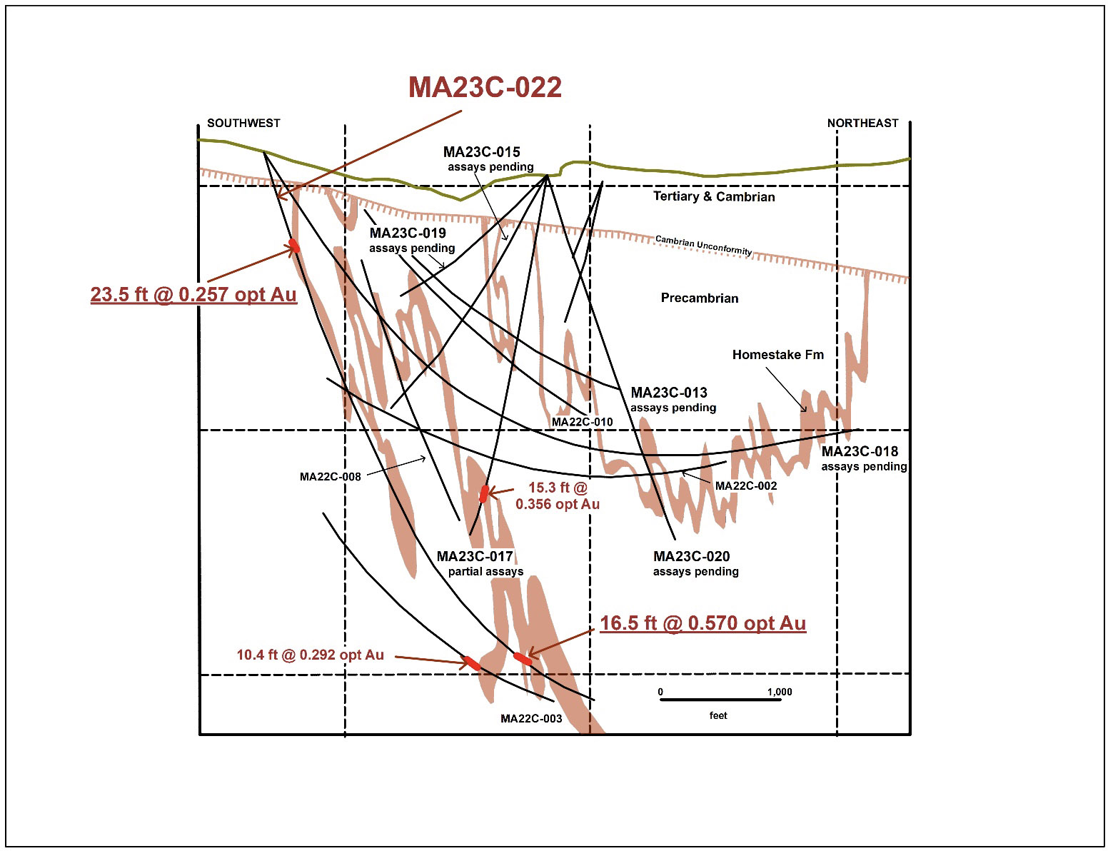 - The upper portion of MA23C-022 intersected 0.257 oz/ton Au over 23.5 feet (8.81 grams/tonne over 7.2 meters) of Homestake-style mineralization.