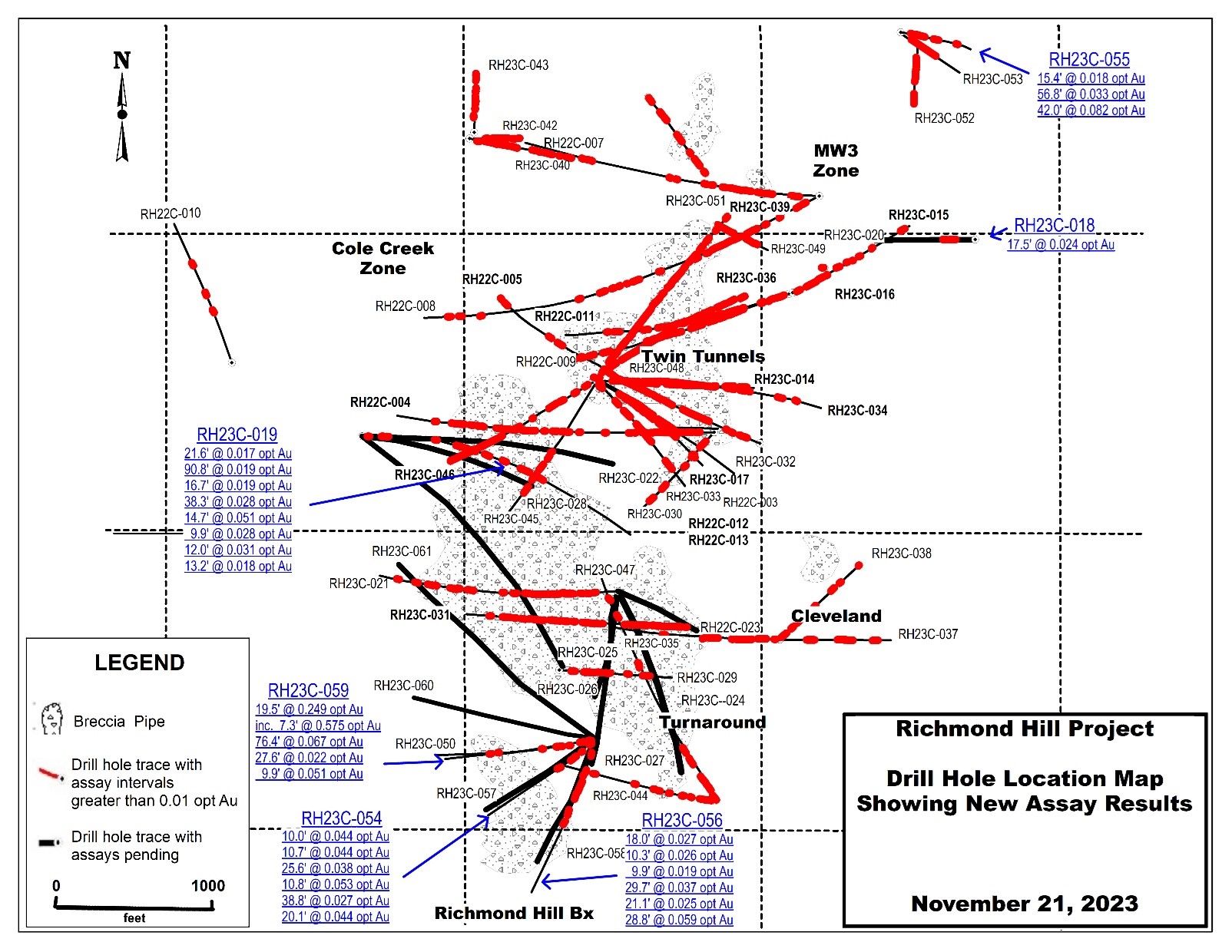 RH23C-054 was designed to validate historical resources below the historical Richmond Hill Mine open pit mine and was angled about 25 degrees to the south of RH23C-059 from the same drill pad. It encountered similar altered Precambrian rocks also outside the historical Richmond Hill Mine pit but returned overall lower grades within a similar interval of greenstone: 0.044 oz/ton Au over 10.0 feet (1.51 grams/tonne over 3 meters), 0.044 oz/ton Au over 10.7 feet (1.51 grams/tonne over 3.3 meters), 0.038 oz/ton Au over 25.6 feet (1.30 grams/tonne over 7.8 meters) and 0.053 oz/ton Au over 10.8 feet (1.82 grams/tonne over 3.3 meters). Mineralization was also encountered at depth below the historical resource pit in Tertiary Breccias and intercepted 0.027 oz/ton Au over 38.8 feet (0.93 grams/tonne over 11.8 meters) and 0.044 oz/ton Au over 20.1 feet (1.51 grams/tonne over 6.1 meters).