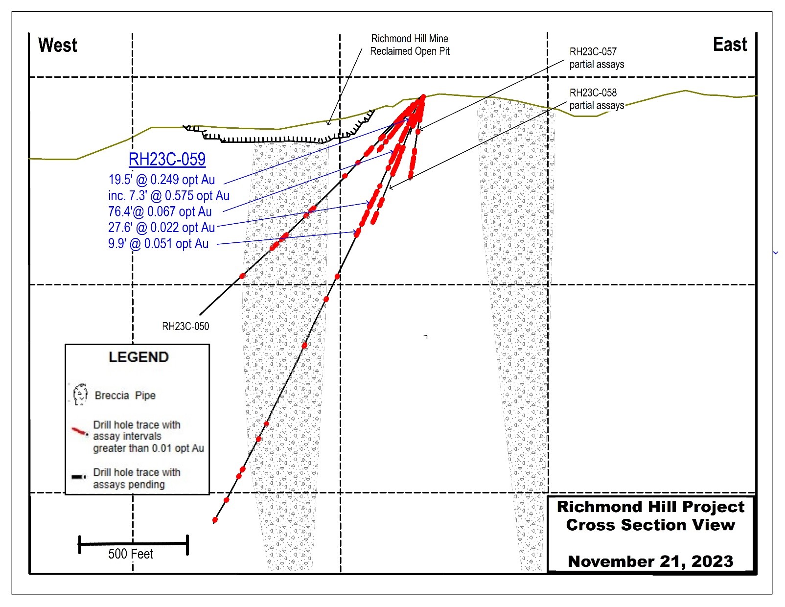 RH23C-059 was drilled due west and was designed to validate historical resources below the historical Richmond Hill open pit mine. The drill intersected 0.575 oz/ton Au over 7.3 feet (19.73 grams/tonne over 2.2 meters) within a larger interval of 0.249 oz/ton Au over 19.5 feet (8.55 grams/tonne over 5.9 meters) within altered Precambrian greenstone at less than 100 feet below the surface outside of the reclaimed pit area. Almost all the mineralization in RH23C-059 occurs in the Precambrian wall rocks adjacent too but not within Richmond Hill Breccia. RH23C-059 intercepts also include 0.067 oz/ton Au over 76.4 feet (2.30 grams/tonne over 23.3 meters), 0.022 oz/ton Au over 27.6 feet (0.75 grams/tonne over 8.4 meters), and 0.051 oz/ton Au over 9.9 feet (1.75 grams/tonne over 3.0 meters).