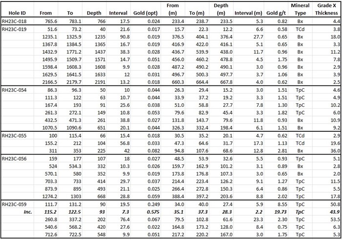 Drill hole RH23C-059 intersected 0.575 oz/ton Au over 7.3 feet (19.73 grams/tonne over 2.2 meters) within a larger interval of 0.249 oz/ton Au over 19.5 feet (8.55 grams/tonne over 5.9 meters). (Table 1 and Figure 1 and 2)