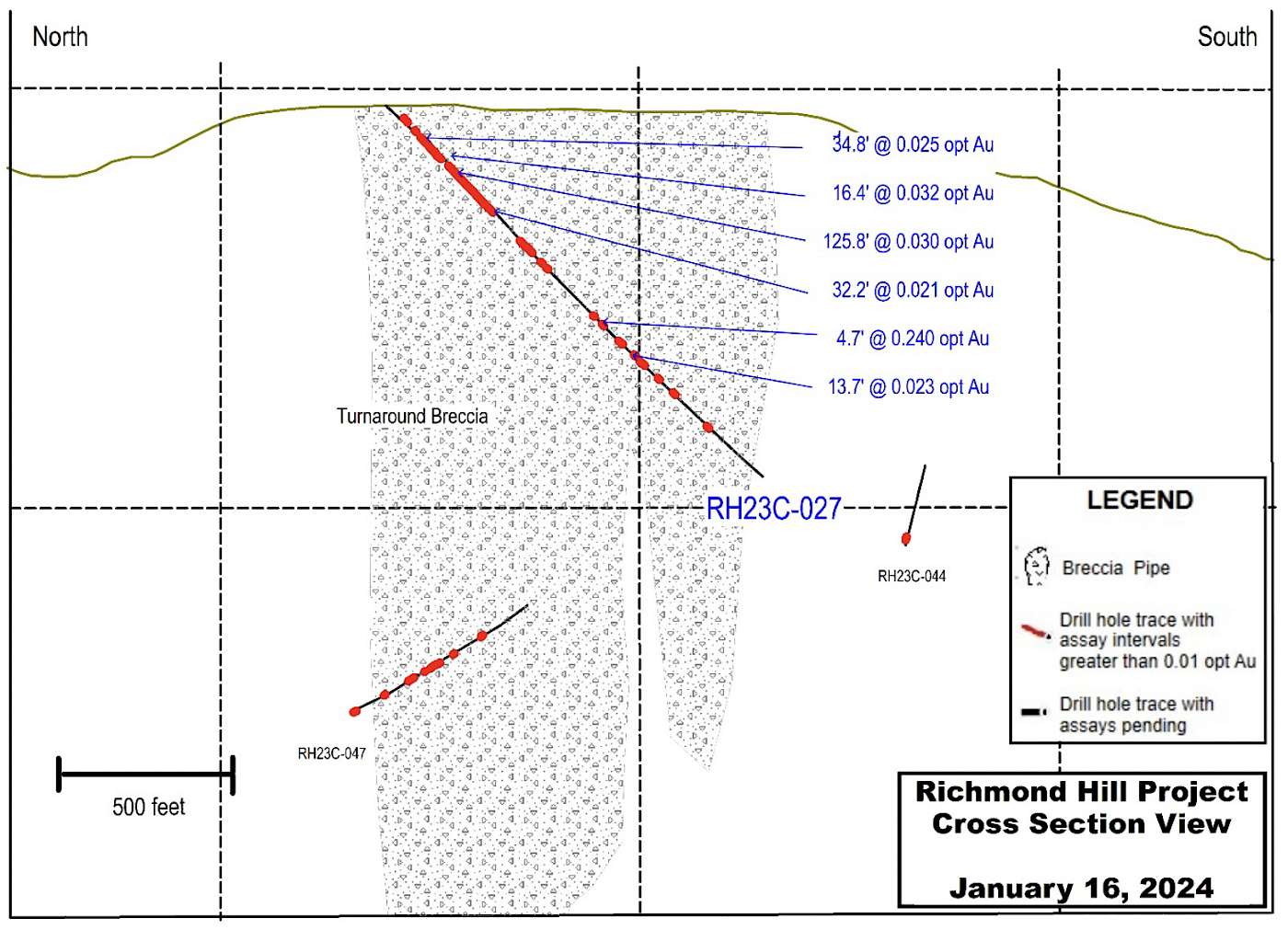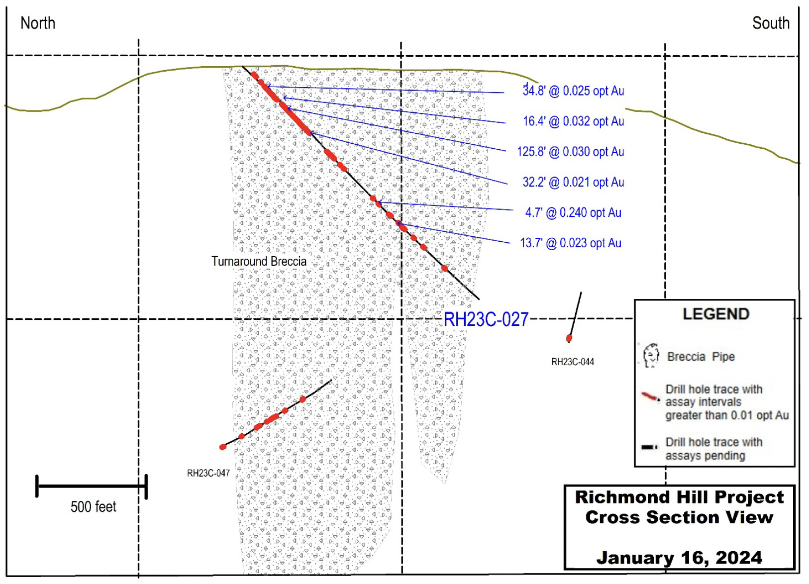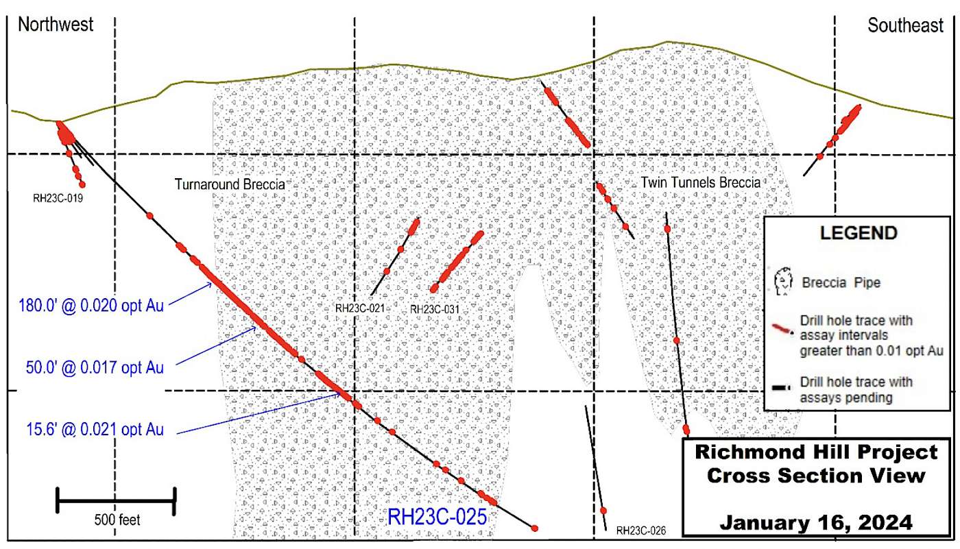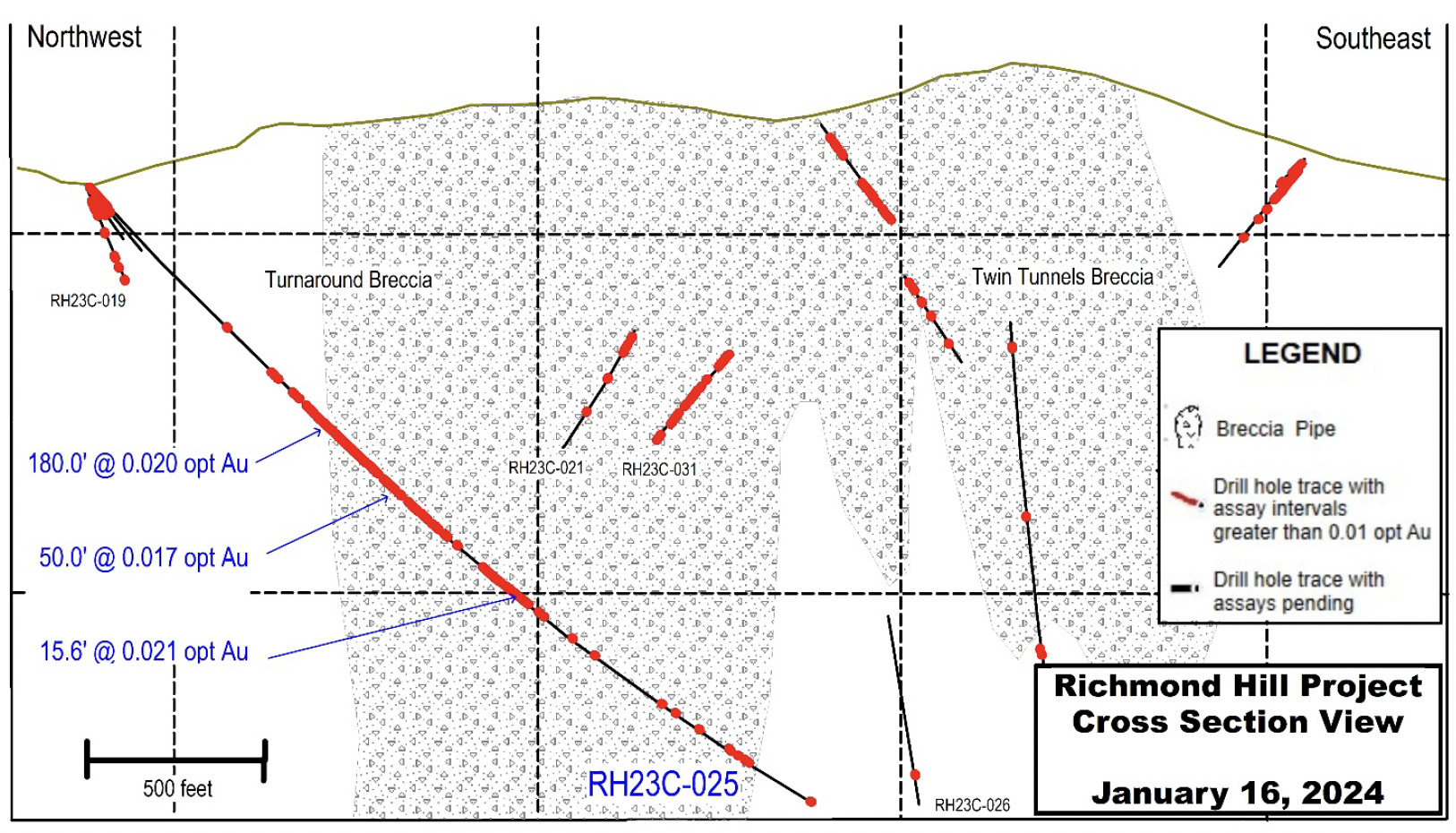 - RH23C-022 intersected 0.033 oz/ton Au over 97.1 feet (1.13 grams/tonne over 29.6 meters); RH23C-025 intersected 0.020 oz/ton Au over 180 feet (0.69 grams/tonne over 54.9 meters; and RH23C-027 intersected 0.030 oz/ton Au over 125.8 feet (1.03 grams/tonne over 38.3 meters) in the northern part of the Turnaround Breccia Pipe at depth. These holes also contain numerous narrower zones of similar grade throughout their length suggesting the breccia pipe hosts significant gold mineralization at deeper levels within the breccia pipe.