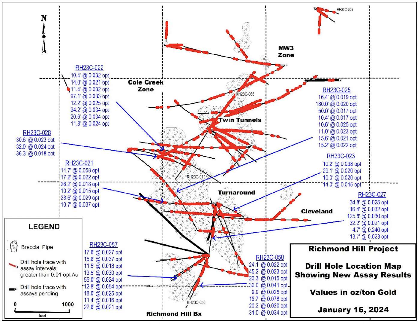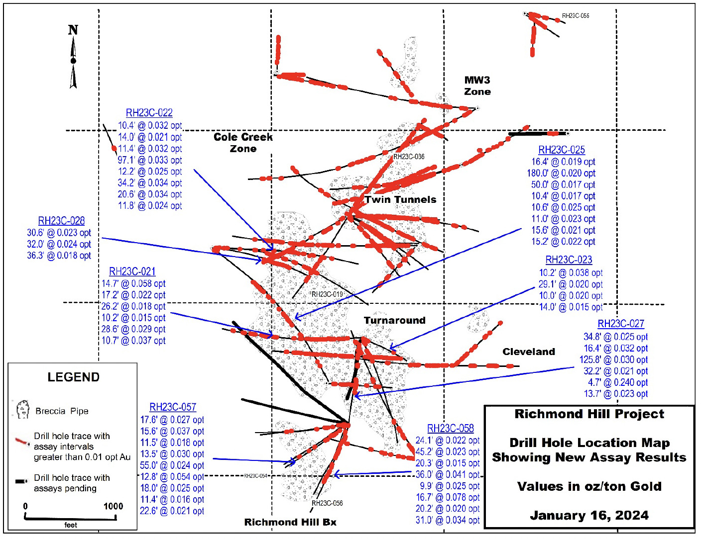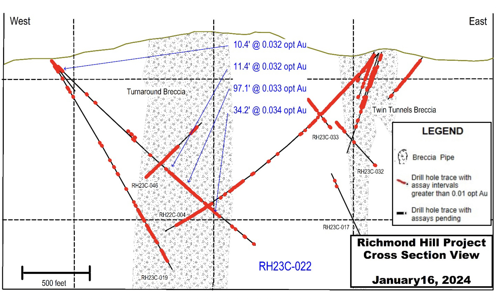 - RH23C-022 intersected 0.033 oz/ton Au over 97.1 feet (1.13 grams/tonne over 29.6 meters); RH23C-025 intersected 0.020 oz/ton Au over 180 feet (0.69 grams/tonne over 54.9 meters; and RH23C-027 intersected 0.030 oz/ton Au over 125.8 feet (1.03 grams/tonne over 38.3 meters) in the northern part of the Turnaround Breccia Pipe at depth. These holes also contain numerous narrower zones of similar grade throughout their length suggesting the breccia pipe hosts significant gold mineralization at deeper levels within the breccia pipe.