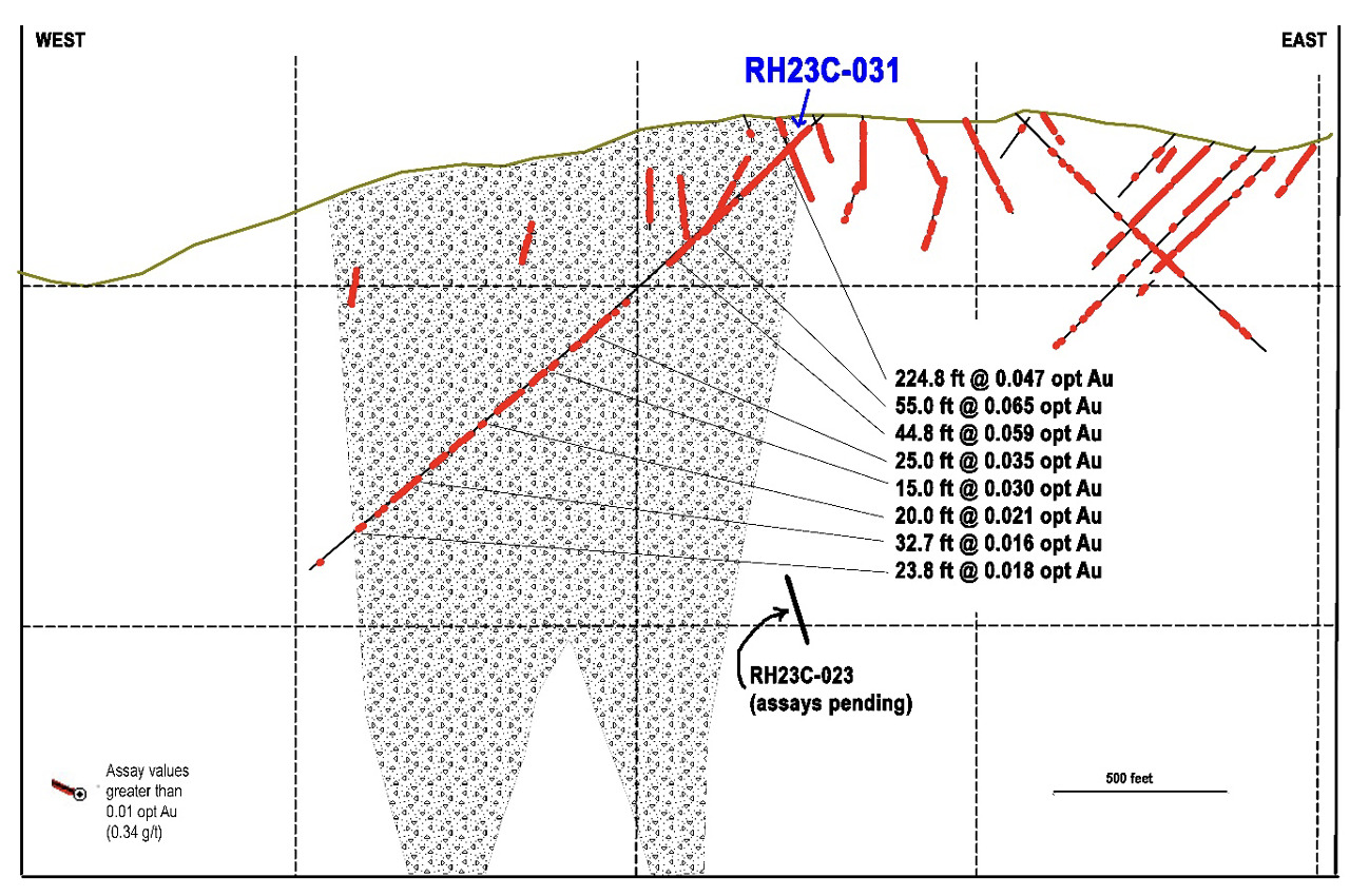 - RH23C-031 at Turnaround Breccia Pipe returned 0.047 oz/ton Au over 224.8 feet (1.61 grams/tonne over 68.5 meters) and 0.065 oz/ton Au over 55.0 feet (2.23 grams/tonne over 16.8 meters).