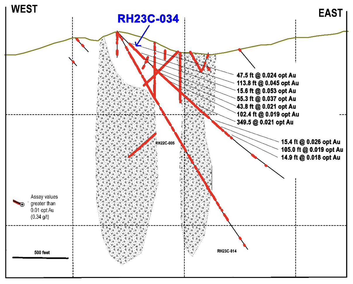 - RH23C-034 at Twin Tunnels Breccia Pipe returned 0.045 oz/ton Au over 113.8 feet (1.54 grams/tonne over 34.7 meters) and 0.021 oz/ton Au over 349.5 feet (0.72 grams/tonne over 106.5 meters).