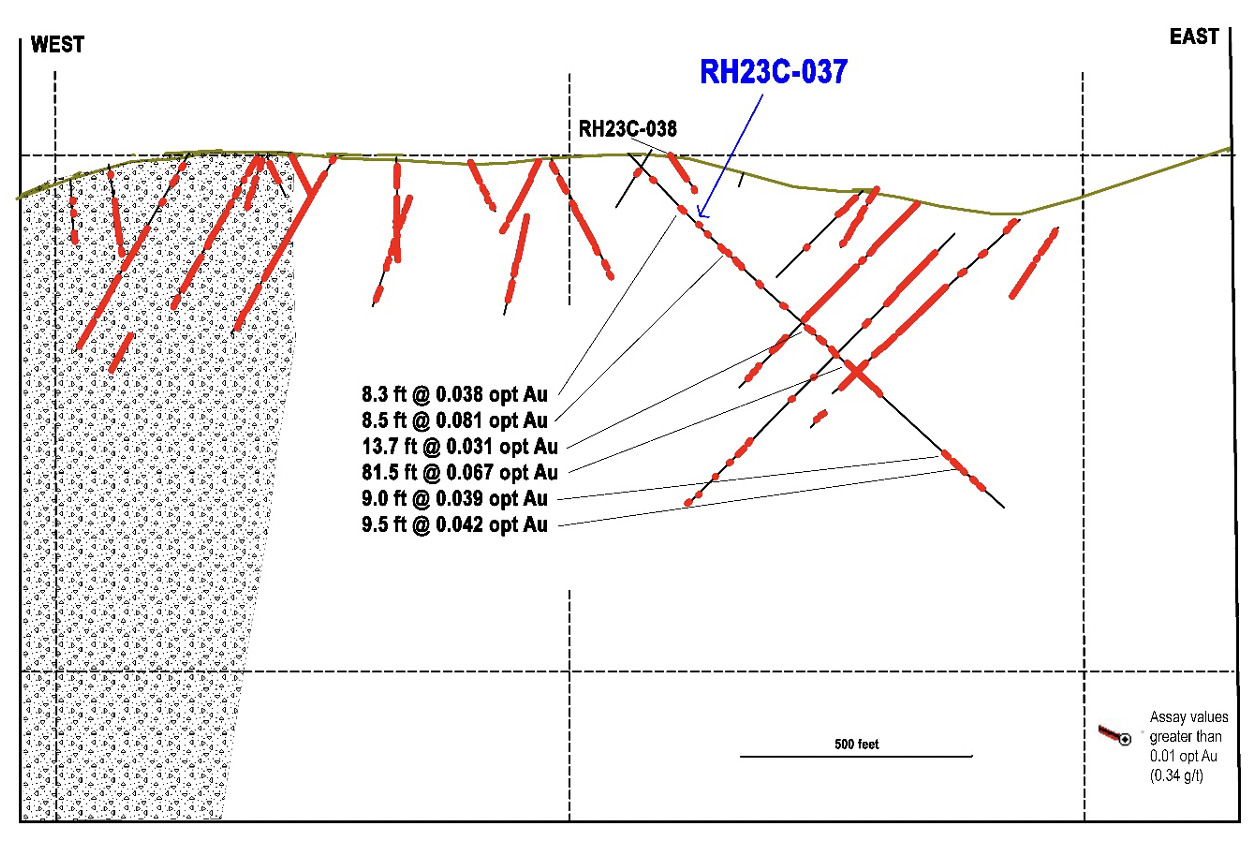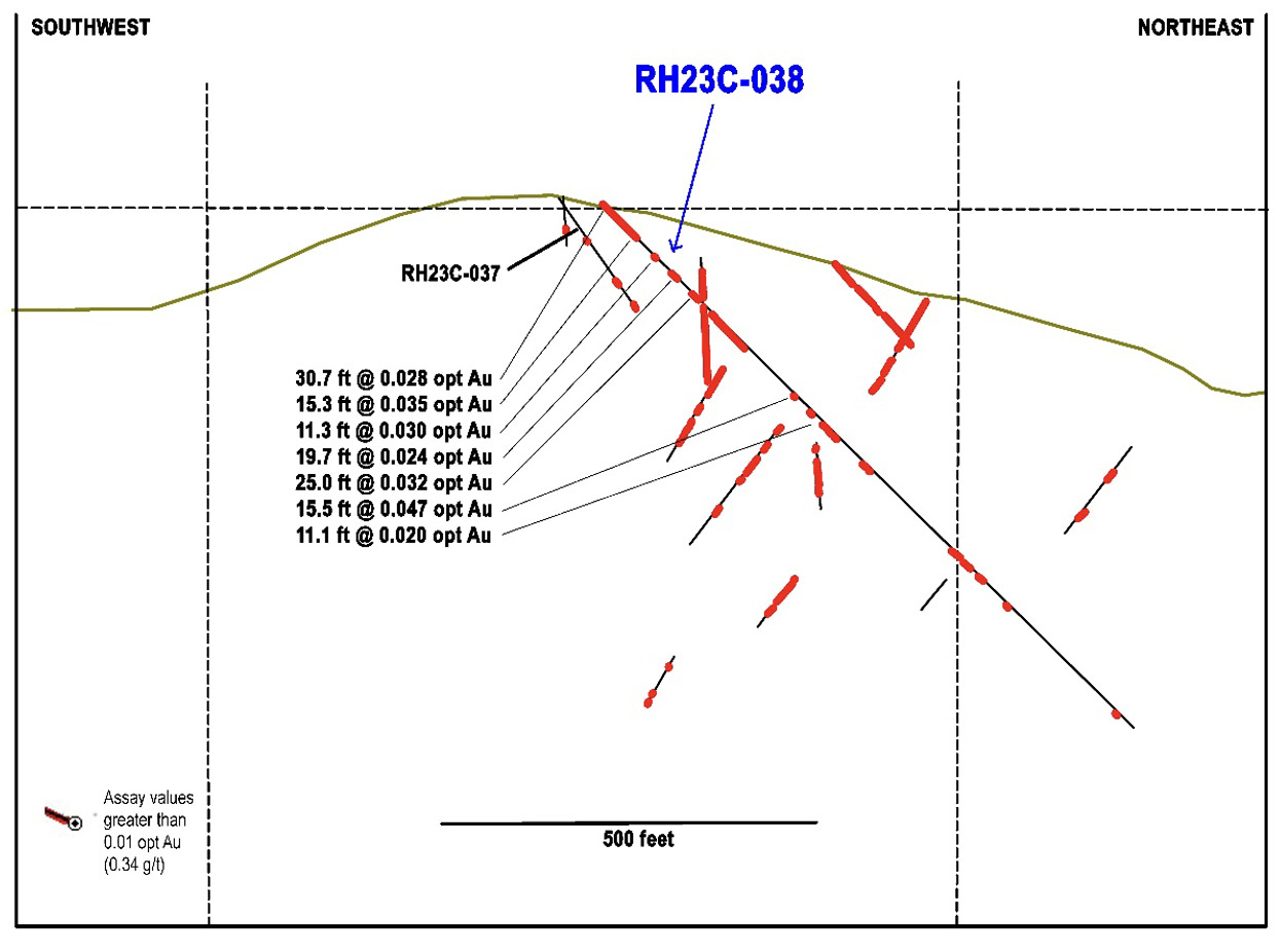 - RH23C-037 at the Cleveland Zone returned 0.067 oz/ton Au over 81.5 feet (2.30 grams/tonne over 24.8 meters).