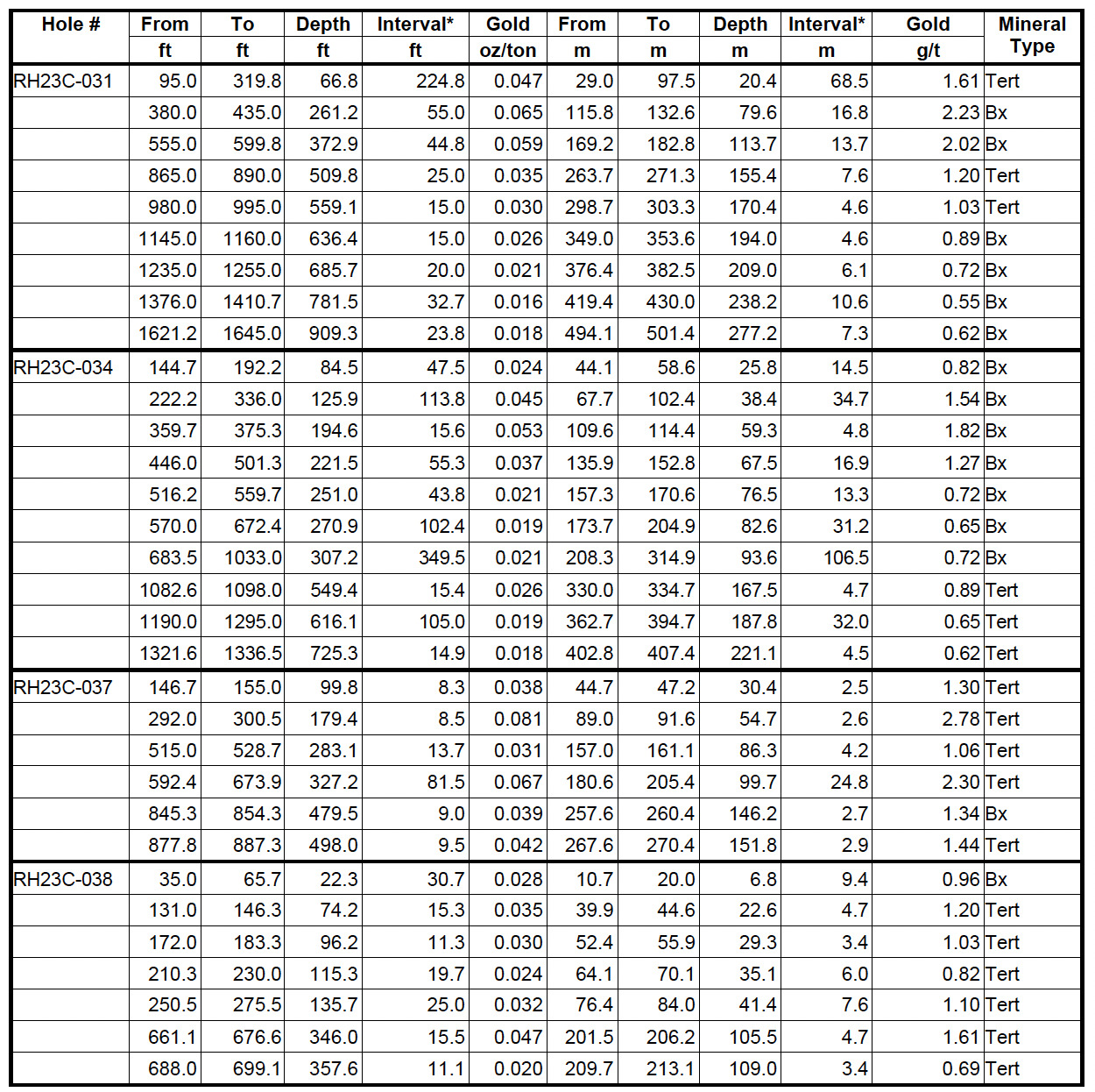 Table 1. RH23C-031, RH23C-034, RH23C-037 and RH23C-038 Drill Results (Imperial / Metric Units)