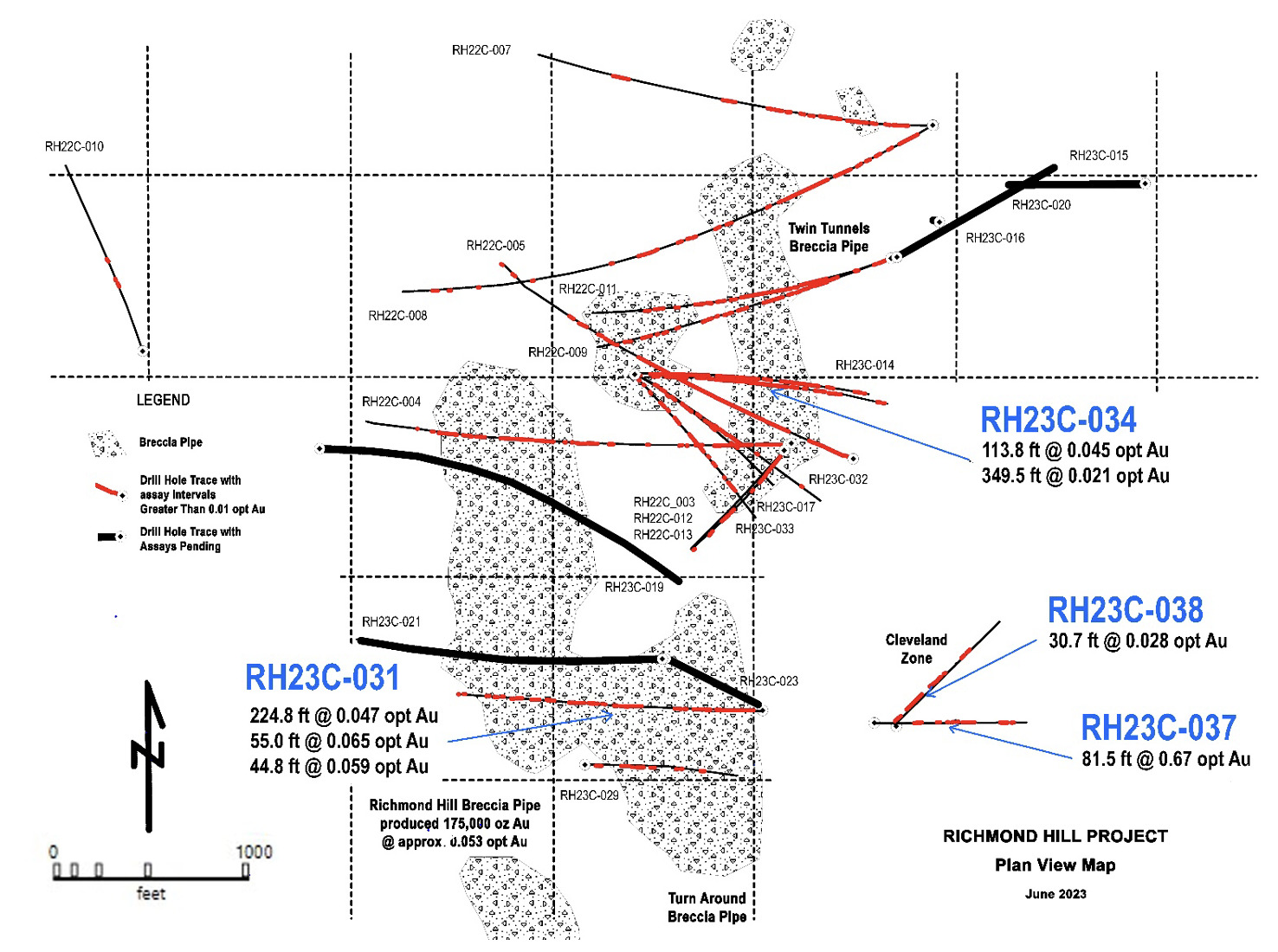 - RH23C-034 at Twin Tunnels Breccia Pipe returned 0.045 oz/ton Au over 113.8 feet (1.54 grams/tonne over 34.7 meters) and 0.021 oz/ton Au over 349.5 feet (0.72 grams/tonne over 106.5 meters).