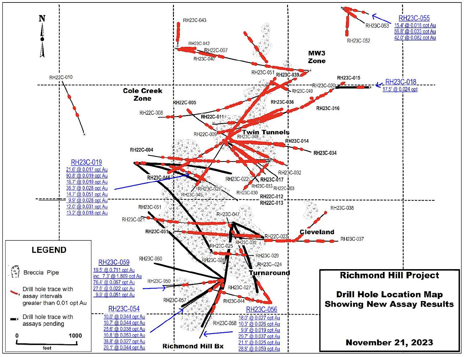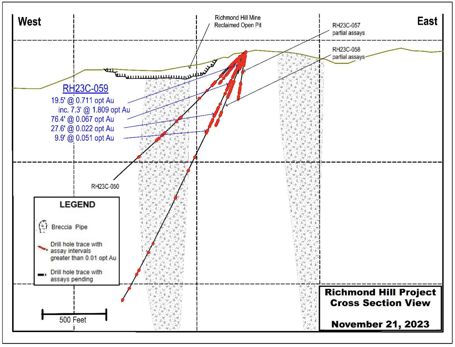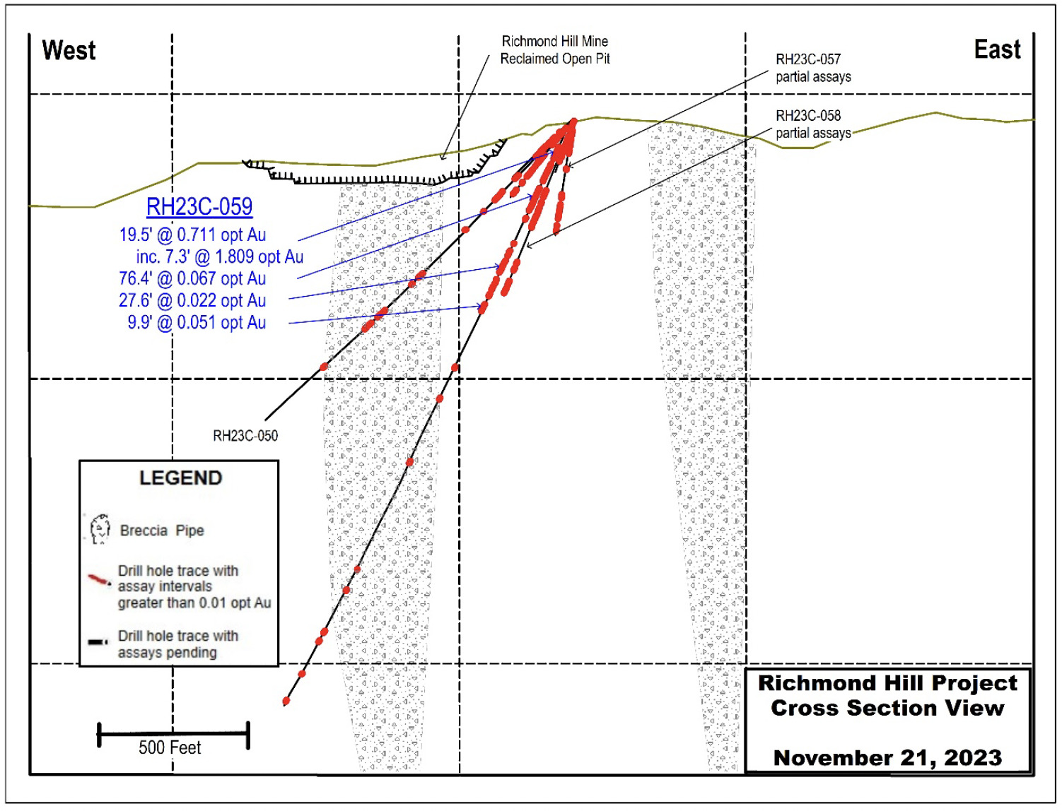 RH23C-059 was drilled due west and was designed to validate historical resources below the historical Richmond Hill open pit mine. The drill intersected 1.809 oz/ton Au over 7.3 feet (62.02 grams/tonne over 2.2 meters) within a larger interval of 0.711 oz/ton Au over 19.5 feet (24.38 grams/tonne over 5.9 meters) within altered Precambrian greenstone at less than 100 feet below the surface outside of the reclaimed pit area. Almost all the mineralization in RH23C-059 occurs in the Precambrian wall rocks adjacent too but not within Richmond Hill Breccia. RH23C-059 intercepts also include 0.067 oz/ton Au over 76.4 feet (2.30 grams/tonne over 23.3 meters), 0.022 oz/ton Au over 27.6 feet (0.75 grams/tonne over 8.4 meters), and 0.051 oz/ton Au over 9.9 feet (1.75 grams/tonne over 3.0 meters).