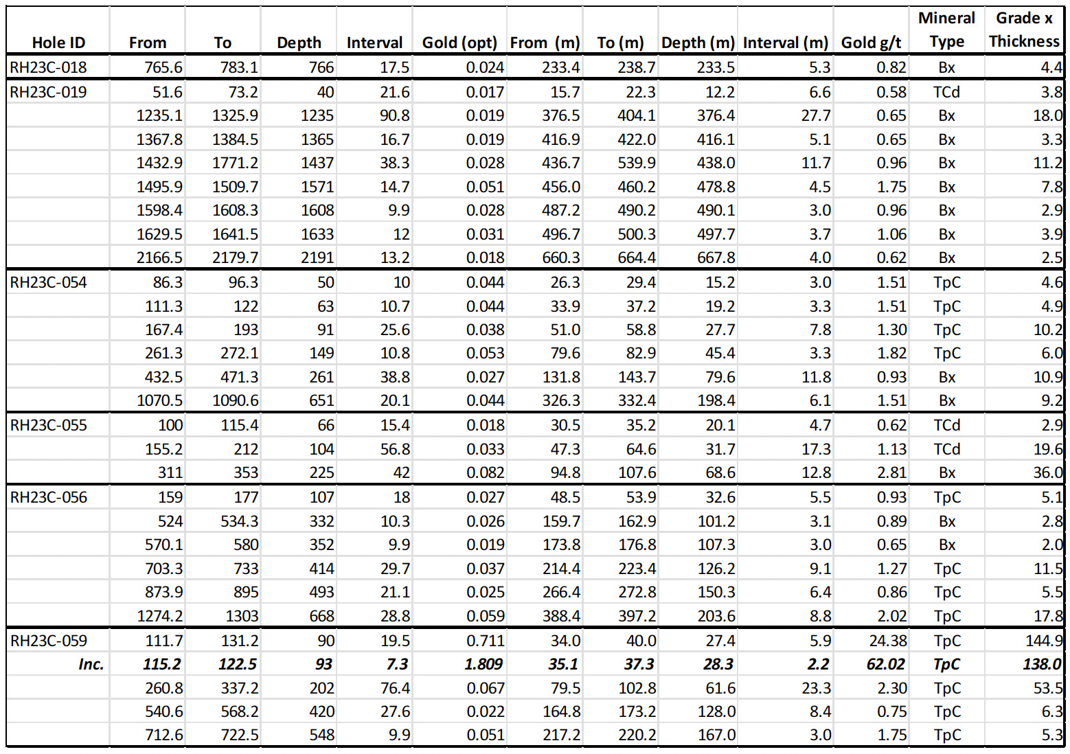 - Drill hole RH23C-059 intersected 1.809 oz/ton Au over 7.3 feet (62.02 grams/tonne over 2.2 meters) within a larger interval of 0.711 oz/ton Au over 19.5 feet (24.38 grams/tonne over 5.9 meters) in an area outside of known historic resource boundaries.